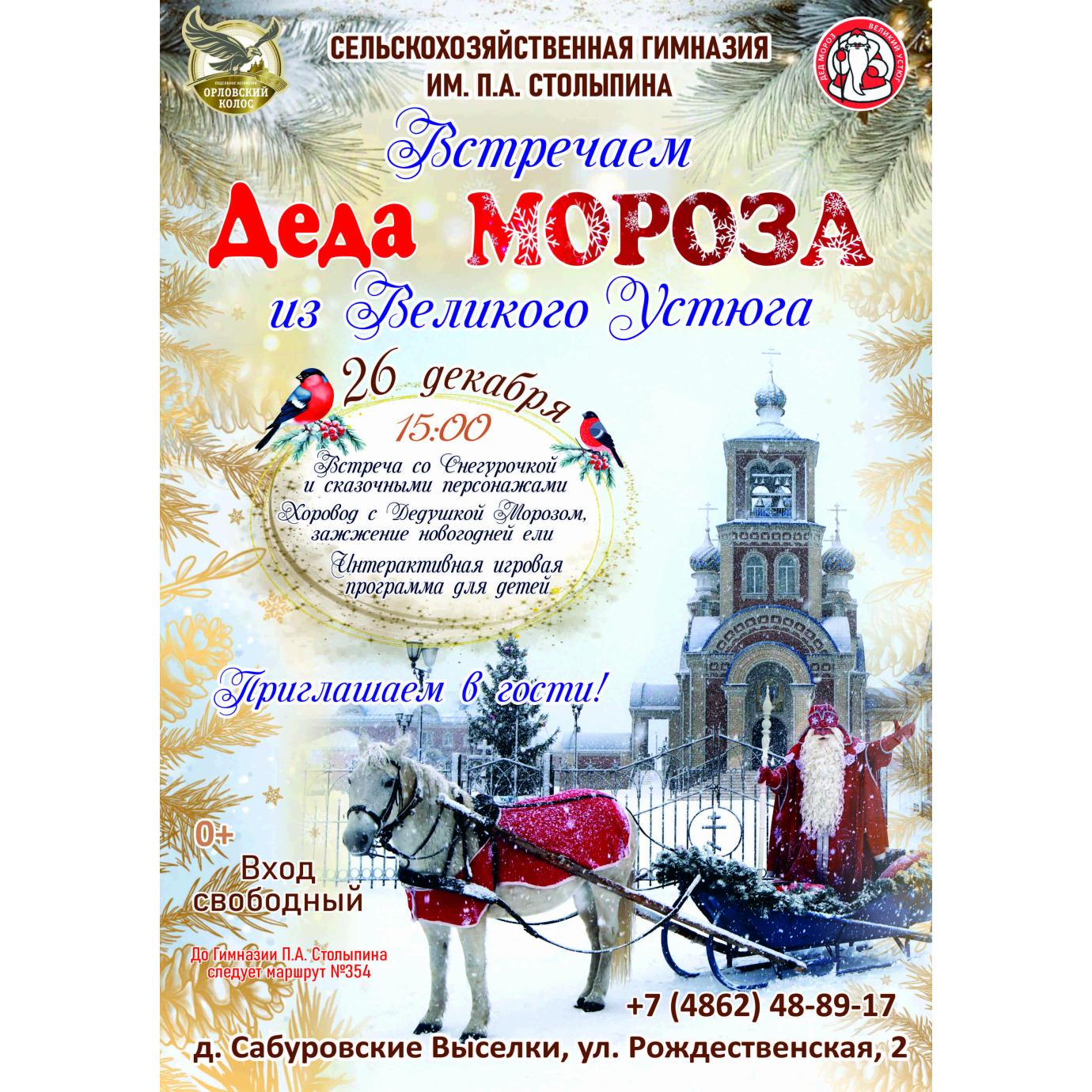 26 декабря в 15:00 в Сельскохозяйственную гимназию им. П. А. Столыпина в гости приедет сам Дед Мороз из Великого Устюга!