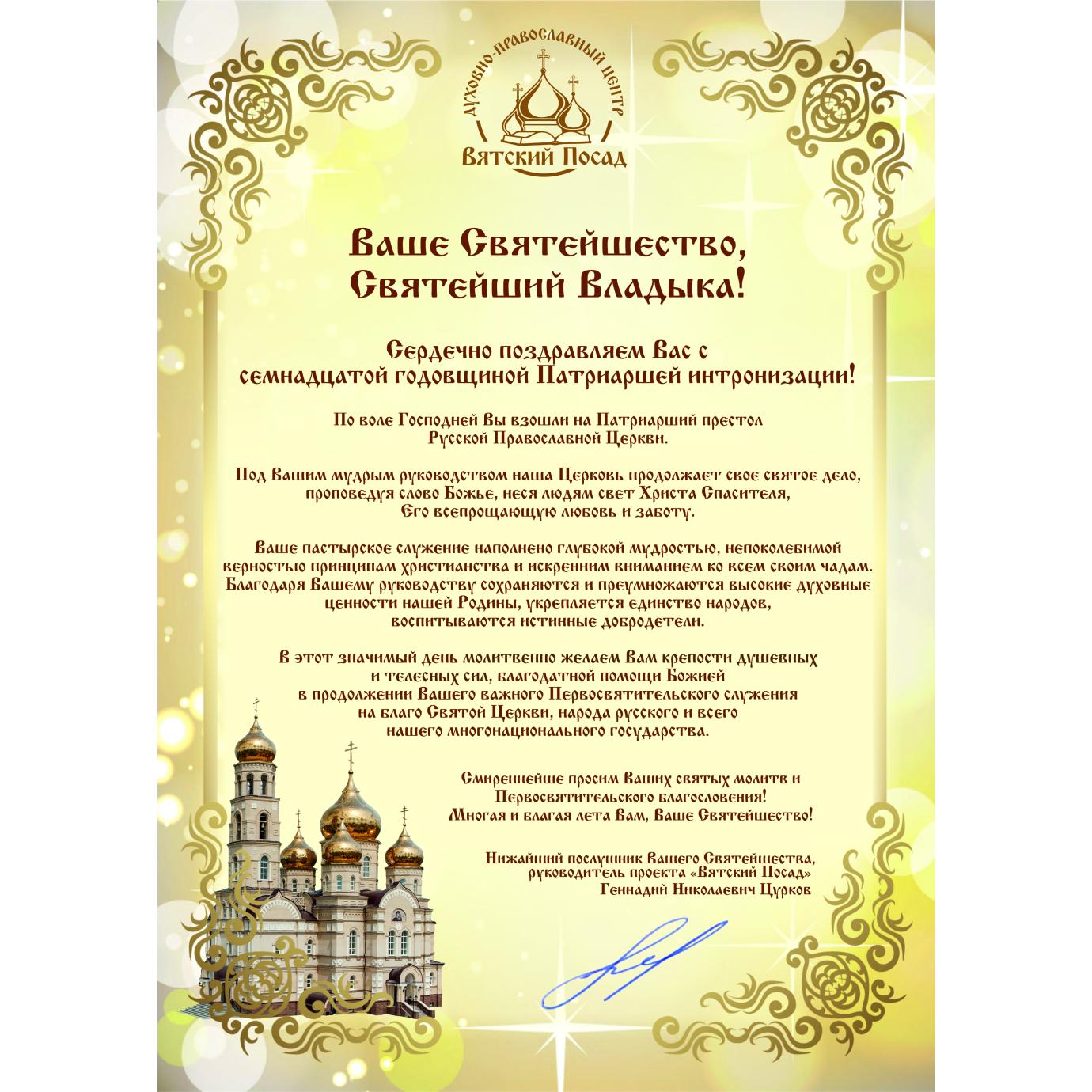 От лица руководителя Духовно‑православного центра «Вятский Посад» Геннадия Николаевича Цуркова и всего коллектива Центра сердечно поздравляем Ваше Святейшество с семнадцатой годовщиной Патриаршей интронизации!