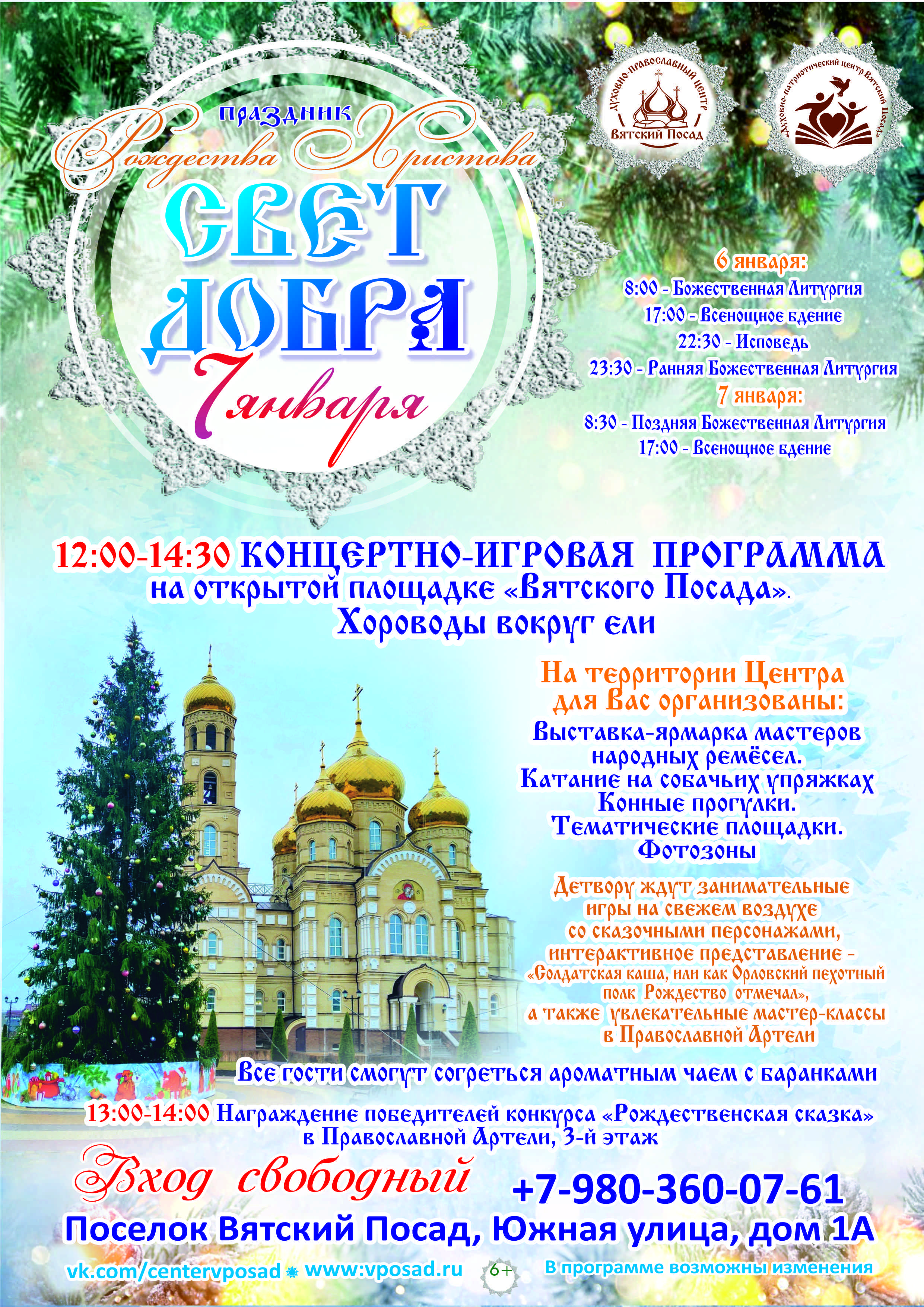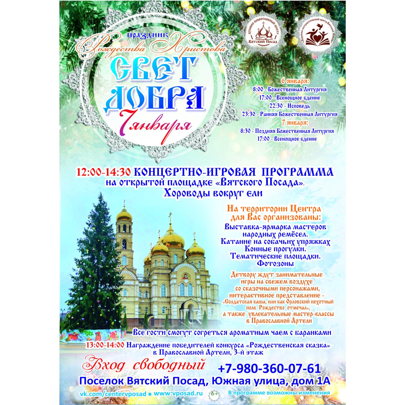 Духовно-православный центр «Вятский Посад» приглашает на праздник Рождества Христова «Свет добра», чтобы отметить этот особенный день в дружеской атмосфере единства, добра и радости.