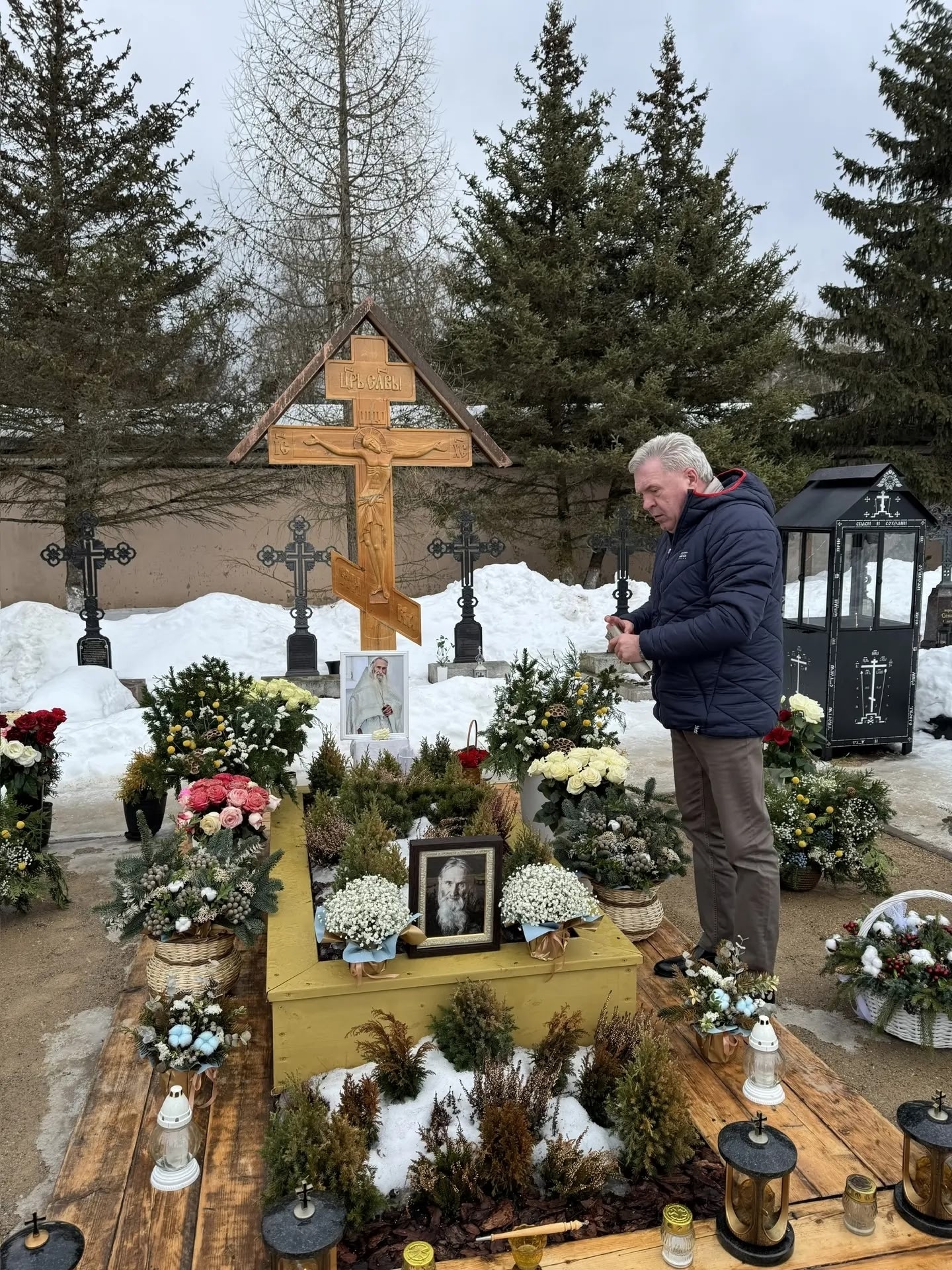 Он возложил цветы и помолился, вспоминая мудрость и доброту батюшки Илия — по благословению и молитвенной поддержки которого был основан Духовно- православный центр «Вятский Посад».