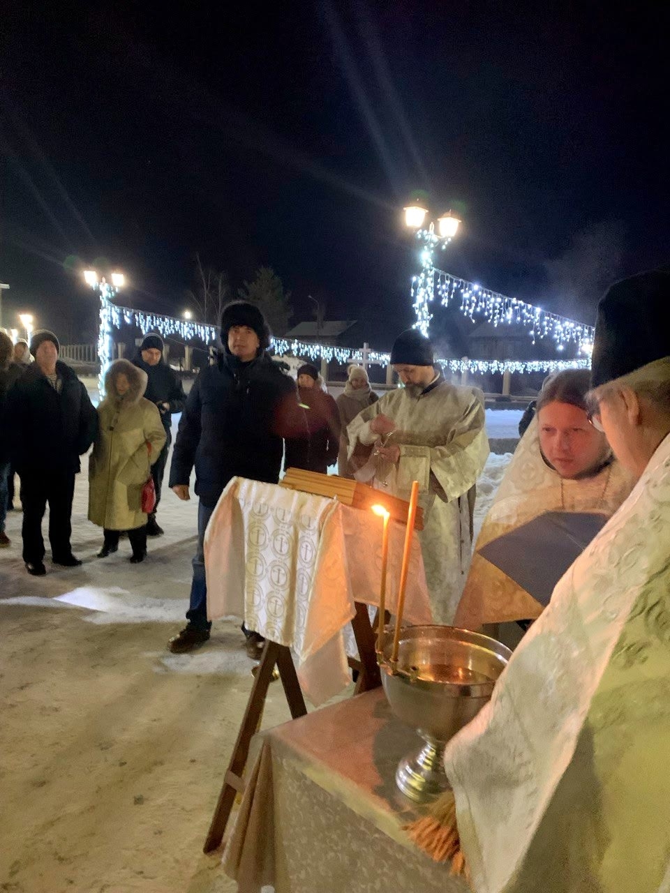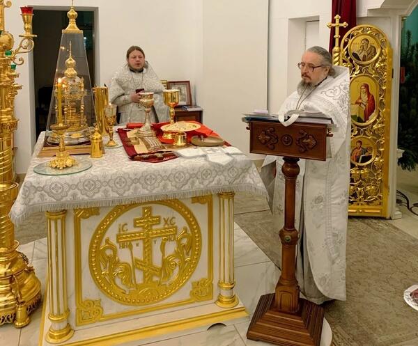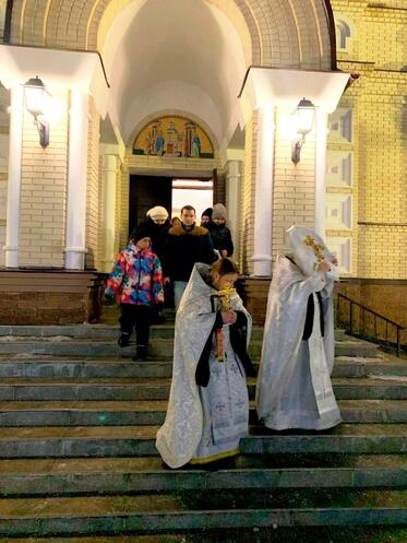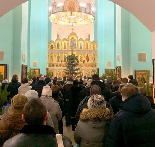В Крещенский сочельник, в храме Сретения Господня Духовно-православного центра "Вятский Посад" состоялось праздничное Богослужение - Царские часы, затем Вечерня переходящая в Божественную Литургию святителя Иоанна Златоуста, по окончании которой состоялся крестный ход и Великое освящение воды на "Иордане".