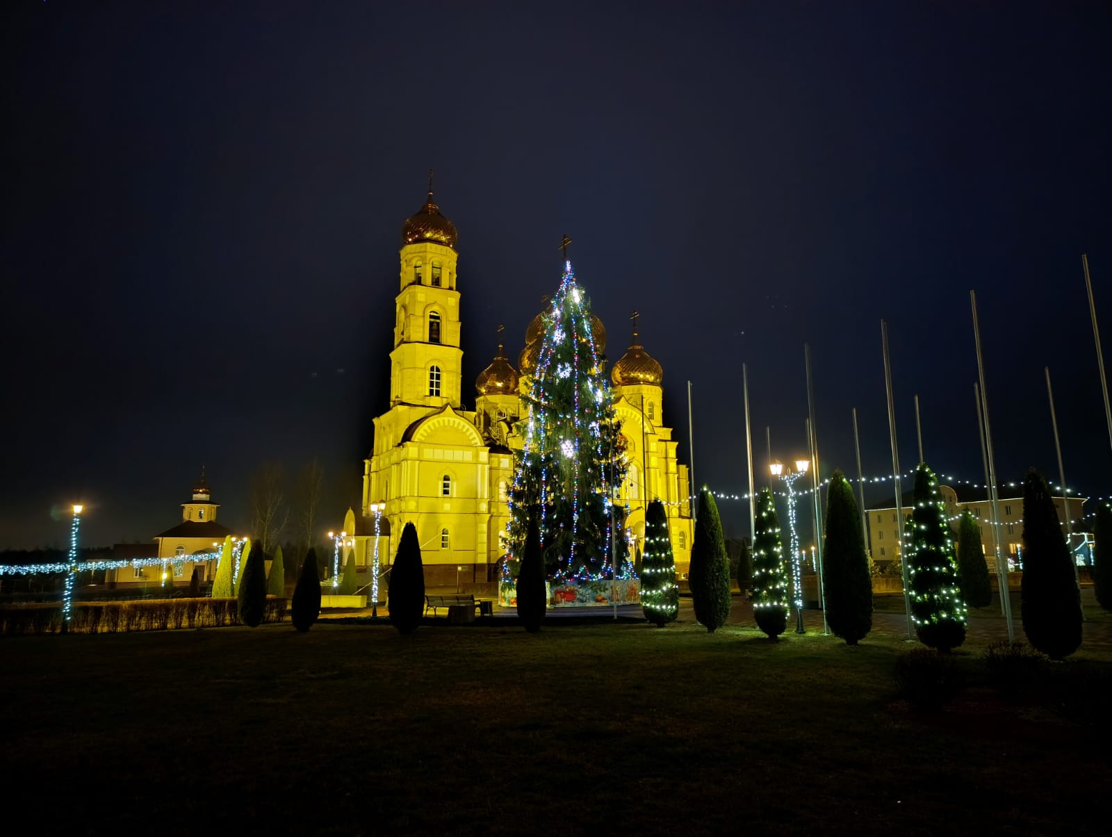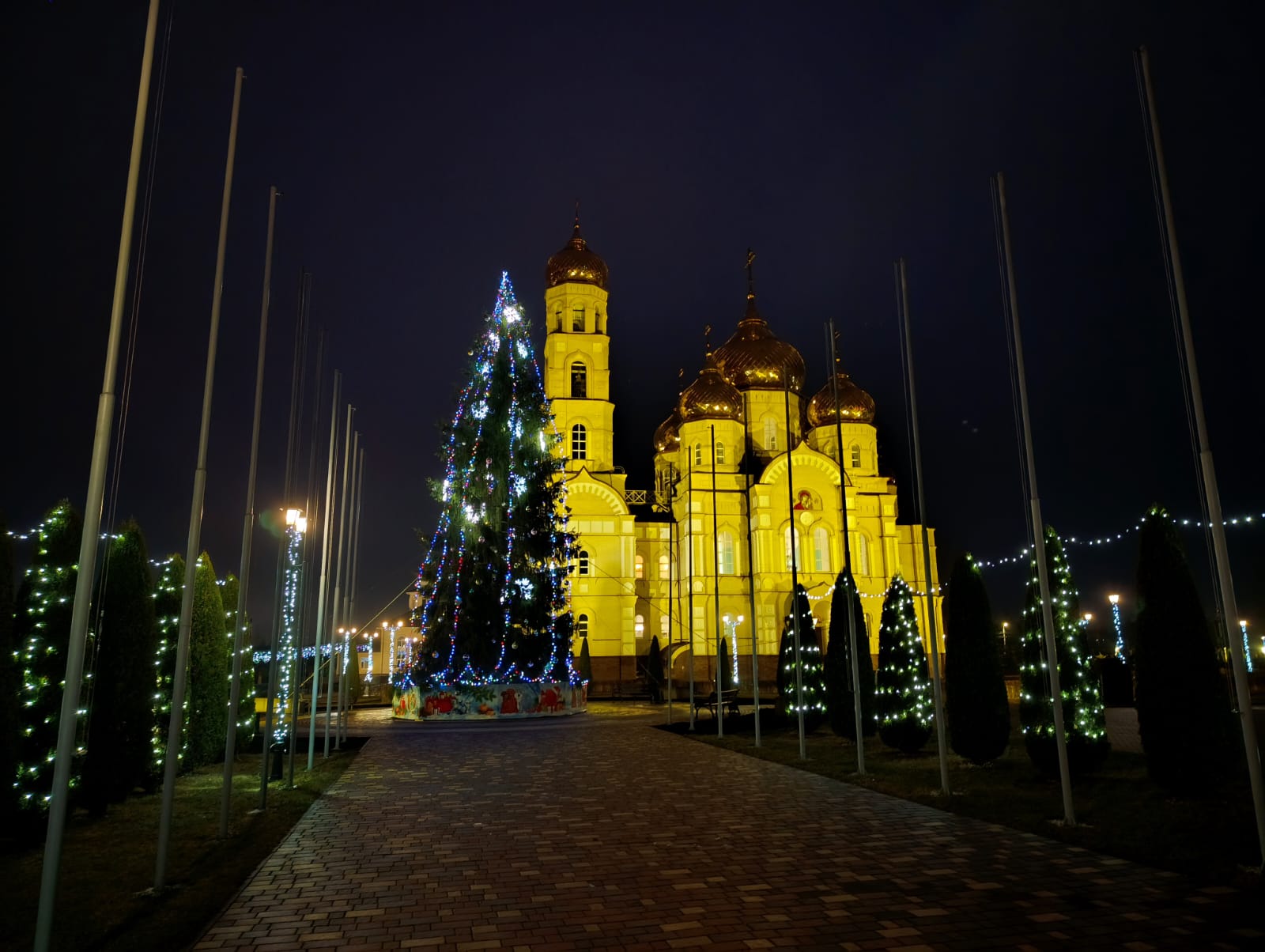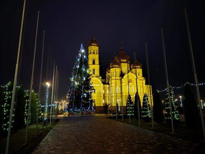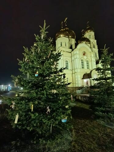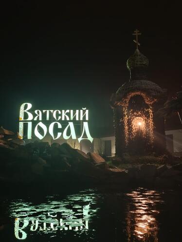 В духовно‑православном центре «Вятский Посад» зажглись праздничные огни. Величественная ель предстала в полном убранстве: её украшают сверкающие игрушки, разноцветные шары и переливающаяся гирлянда.