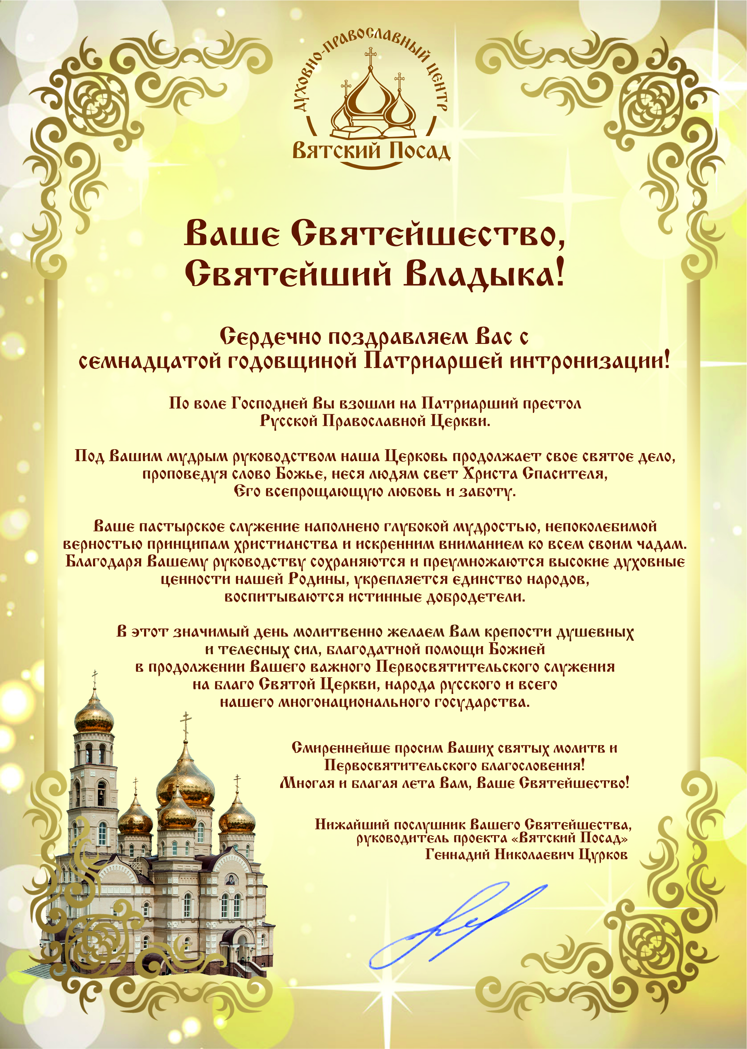 От лица руководителя Духовно‑православного центра «Вятский Посад» Геннадия Николаевича Цуркова и всего коллектива Центра сердечно поздравляем Ваше Святейшество с семнадцатой годовщиной Патриаршей интронизации!